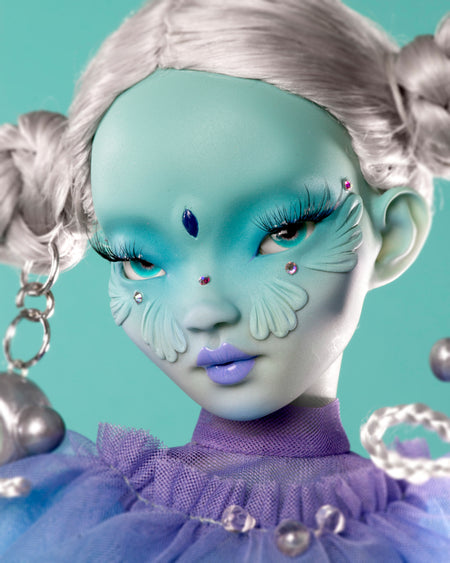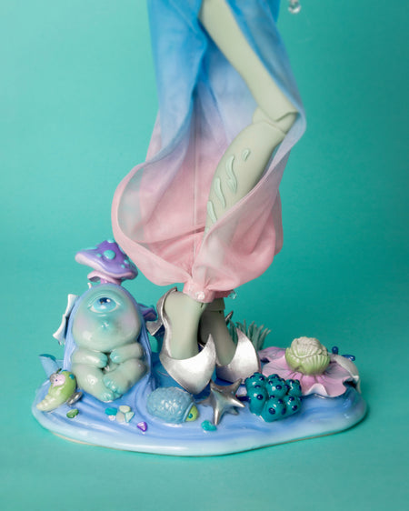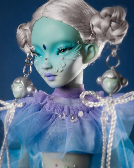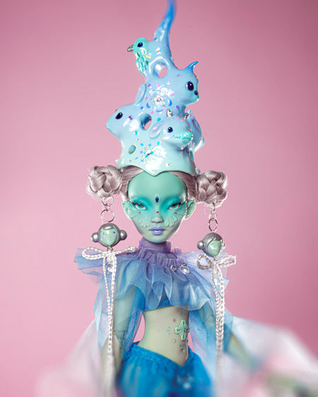 Media: Resin doll with 16 points of articulation internally strung with elastic; inset acrylic eyes; epoxy clay doll embellishments; polymer clay + epoxy clay hat and base; acrylic paint; natural mohair wig; 3D-printed resin shoes; poly-mesh fabric.